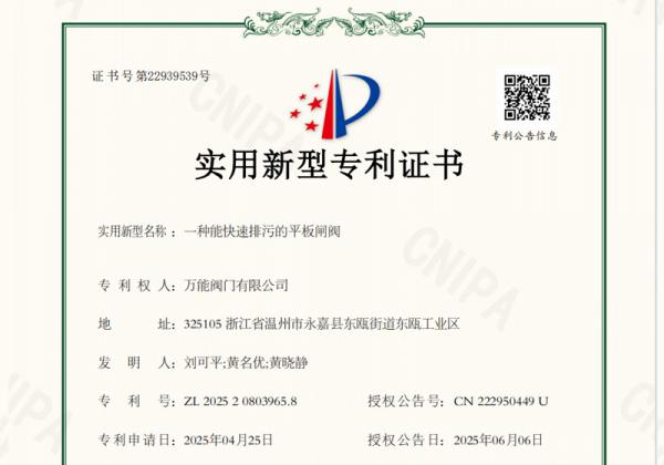 近日,萬能閥門有限公司成功獲得了一項關(guān)于快速排污平板閘閥的專利。專利號為ZL 2025 2 0803965.8,授權(quán)公告號為CN 222950449 U。這項新技術(shù)的獲得不僅進(jìn)一步鞏固了公司在閥門領(lǐng)域的技術(shù)優(yōu)勢,也為市場提供了更高效、更環(huán)保的排污解決方案。